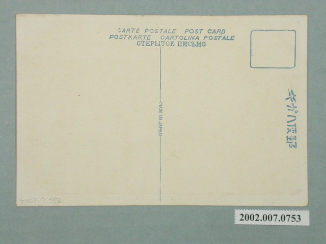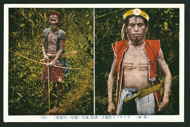 1.本物件以原住民為主題,彩色樣式。正面為兩張圖像並列。圖像內皆為男性穿著傳統服飾。左方圖像,男子頭戴紅色帽子、手握傳統狩獵器具,類似十字弓。右方圖像,男子佩帶黃色頭飾,胸前有三道紋身,身上佩有蕃刀。下方以漢字書寫「(臺灣)サイセツト族頭目ノ盛裝(胸部ノ橫線ハ戰勳彰)」大意為:臺灣賽夏族原住民頭目穿著盛裝,胸前的橫線紋身為出戰的勳章。背面右上角為郵票黏貼處,右側有以漢字、平假名書寫之「郵便はがき」,上方以英文字母書寫「CARTE POSTALE」、「Postkarte-Cartolina Postale-PostCard」、「OTEPLITOE IINCBMO」。2.臺灣的原住民屬南島語族,日治時期著手對於原住民進行調查並分類為「族」。其中西元1897年伊能嘉矩為調查原住民,進行為期192天的踏查,後將臺灣原住民分為七個族群,包括泰雅族、布農族、鄒族、澤利先族、排灣族、漂馬族、阿美族。