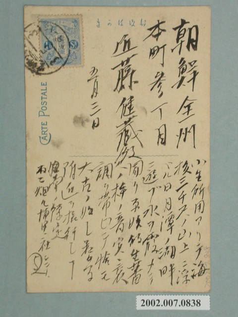 2.屬實寄封明信片,收信人為朝鮮全州本町参丁目的近藤健藏,寄信人文字過於潦草,難以辨認,書信內容主要為到日月潭遊玩的感受。