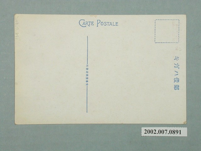 1.本物件為以臺灣農村為主題之明信片,其正面為農村傍晚景象,畫面中可見一農人於青草邊牽著水牛,左後方有一茅草屋,後方則有兩株瘦高的檳榔樹,明信片右上方有「(台灣)農村のたそがれ」、「222. A COUNTRY VIEW IN THE DUSK,FORMOSA.」;背面為空白明信片直式書寫面,以藍色單色印刷,左上角為郵票黏貼處,正上方有「郵便ハガキ」字樣,左側有「CARTE POSTALE」,正中間有「生蕃屋商店發行」。本件正面圖案與藏品2001.008.1271相同。