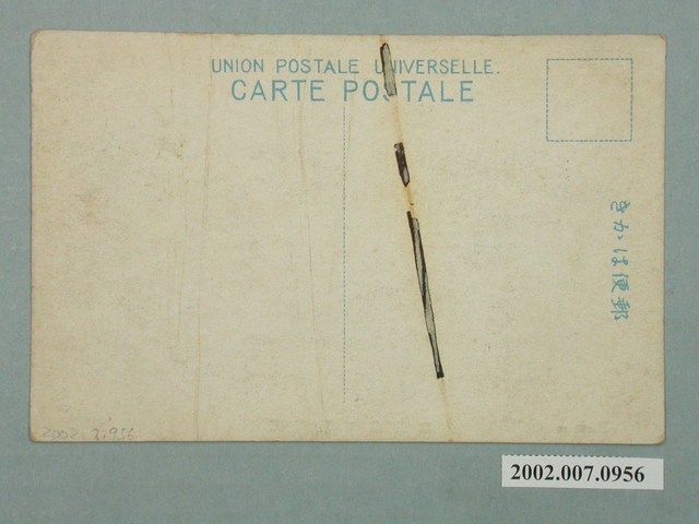 1. 本物件為以臺灣鹽田結晶池為主題之明信片,其正面為鹽田結晶池黑白照片,影像中為阡陌交錯延伸的鹽田,鹽田之中間處,有6個雙雙併排的圓形凹洞為鹽滷池,影像前方中央位置,亦有一個圓形向下的鹽滷池,影像右上位置,有4棟單層樓式平房,影像下方標有「臺灣鹽田結晶池」、「10」、「(K)」。背面為空白明信片橫式書寫面,以藍色單色印刷,右上方框為郵票黏貼處,右側為「郵便はがき」,上方為「UNION POSTALE U□IVERSELLE.」、「CARTE PO□TALE」,中間有一道分隔線,其右方有一由左上自右下的毀損線條。