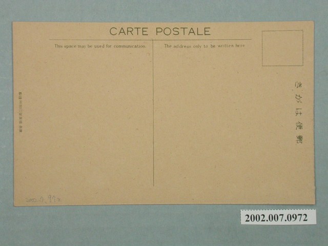 1.本物件為以始政四十周年紀念臺灣博覽會東京館為主題之明信片,其正面為東京館建築黑白照片,畫面中可見斗大的「東京館」字樣,建築方正簡約,入口處上方有遮棚,畫面左側則有一噴泉,遠景可見兩面日本國旗,明信片左上方有「東京館」,右下角有「始政四十周年記念臺灣博覽會」;背面為空白明信片橫式書寫面,以黑色單色印刷,右上方為郵票黏貼處,右側有「郵便はがき」,左側有「廣島精美堂印刷所謹製」,正上方則有「CARTE POSTALE」以及兩行字樣,由左至右為「This space may be used for Communication」、「The Address Only to be Written Here」。2.始政四十年紀念臺灣博覽會為西元1935年10月至11月以臺北為主舉辦的博覽會,分為四個會場,第一會場於臺北公會堂附近,第二會場於今二二八公園,第三會場於迪化街附近,第四會場於陽明山,而各地政府也各自舉辦小規模的展覽和活動。 東京館位於第二會場內,為特設館,分為8個場面,主要為展示東京是境內的各石化工業、紡織業等現代化工業會社之營業狀況,不同於其他日本地方館,並沒有特產的展出與販賣。