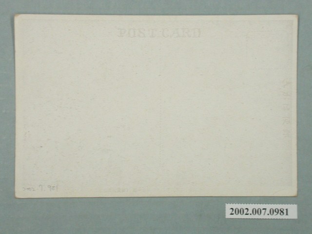 1.本物件為以始政四十周年紀念臺灣博覽會第一會場為主題之明信片,其正面為從入口望向歷史館、交通館及本館之黑白照片,畫面中可見正中間後方建築有許多窗戶,該建築即為公會堂,亦為第一會場本館,其前方一點左側位置為交通館,右側近景之日式建築為歷史館,明信片正下方有「(始政四十周年記念臺灣博覽會) 第一會場入口歷史舘より交通舘及本館(公會堂)」,明信片右上方有一藍色圓形紀念戳章,內有博覽會全名以及「昭和十年自十月十日至十一月二十八日」,並有椰子樹圖樣;背面為空白明信片橫式書寫面,以灰色單色印刷,右上方為郵票黏貼處,右側有「郵便はがき」,正上方有「POST CARD」字樣。2.始政四十年紀念臺灣博覽會為西元1935年10月至11月共50日的博覽會,舉辦地點以臺北為主,為宣傳其統治的政績,及臺灣各項政策的成果,主要分為四個會場,第一會場於臺北公會堂附近,所謂本館即指公會堂,是此次博覽會之中心之一;日本歷史館位在榮町門外,向臺灣人民呈現日本歷史;交通土木館則位在公會堂一角,主要展出日本於臺灣之交通建設,其中以鐵路最為重要,同年四月發生臺中州大地震,遂提出都市模型,希冀重振並建設更完善、便利的都市。