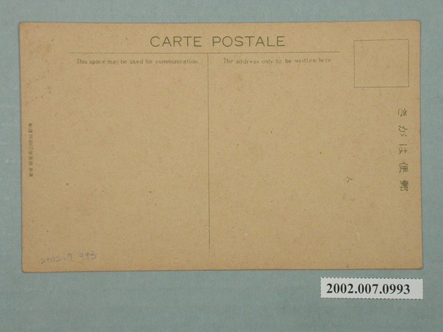 1.本物件為以始政四十周年紀念臺灣博覽會專賣館為主題之明信片,其正面為專賣館黑白照片,畫面中可專賣館建築門面有一高聳立塔,上有日本國旗,入口處有「專賣館」字樣,左右兩側皆可見其他場館,右側有一大型玻璃瓶造景,明信片右上方有「始政四十周年紀念臺灣博覽會」字樣,左上方則有「專賣館」字樣;背面為空白明信片橫式書寫面,以黑色單色印刷,明顯有黏貼過之痕跡,右上方為郵票黏貼處,右側有「郵便はがき」,左側隱約可見「廣島精美堂印刷所謹製」,正上方則有「CARTE POSTALE」以及兩行字樣,由左至右為「This space may be used for Communication」、「The Address Only to be Written Here」。2.始政四十年紀念臺灣博覽會為西元1935年10月至11月共50日的博覽會,舉辦地點以臺北為主,為宣傳其統治的政績,及臺灣各項政策的成果,主要分為四個會場,第一會場於臺北公會堂附近,第二會場於今二二八公園,第三會場於迪化街附近,第四會場於陽明山,而各地政府也各自舉辦小規模的展覽和活動。專賣館位於第二會場夜間開放區中央,由專賣局出資所設立,所展出之主題以當時專賣局的專賣物品為主:酒、菸草、鹽、鴉片以及樟腦。