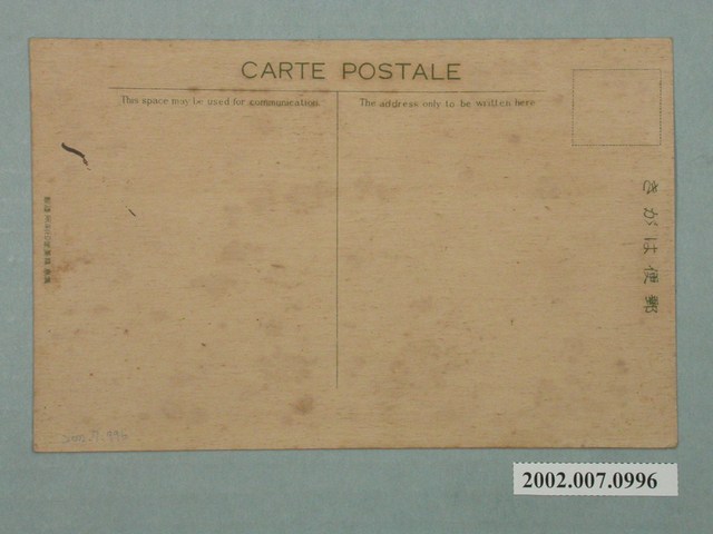 1.本物件為以始政四十周年紀念臺灣博覽會船舶館為主題之明信片,其正面為船舶館黑白照片,畫面中船舶館正上方有一大型船舵裝飾,入口處上方有「船舶館」立體字樣,館前空地則有橫條紋樣式的燈塔造景,前方有眾多參觀人潮,明信片左下方有「始政四十周年紀念臺灣博覽會」字樣,左上方則有「船舶館」字樣;背面為空白明信片橫式書寫面,以深藍色單色印刷,右上方為郵票黏貼處,右側有「郵便はがき」,左側有「廣島精美堂印刷所謹製」,正上方則有「CARTE POSTALE」以及兩行字樣,由左至右為「This space may be used for Communication」、「The Address Only to be Written Here」。2.始政四十年紀念臺灣博覽會為西元1935年10月至11月共50日的博覽會,舉辦地點以臺北為主,為宣傳其統治的政績,及臺灣各項政策的成果,主要分為四個會場,第一會場於臺北公會堂附近,第二會場於今二二八公園,第三會場於迪化街附近,第四會場於陽明山,而各地政府也各自舉辦小規模的展覽和活動。專賣船舶館位於第二會場內,展示主題為航海交通發展,由大阪商船、近海郵船、大連汽船、遞信部海事課共同籌劃。