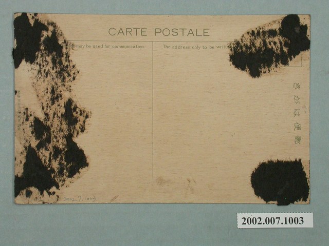 1.本物件為以始政四十周年記念臺灣博覽會,第二文化設施館為主題之明信片,正面為第二文化設施館黑白照片,畫面中可見其建物正面樣貌,建物上有「第二文化施設館」字樣,並有即將進入觀賞展覽之民眾,右下有1段文字「始政四十周年紀念臺灣博覽會」,左上有1段文字「第二文化施設館」,右上有1藍色圓形戳印,印有建物與山的圖案,由上至下有「始政四十周年記念臺灣博覽會」、「昭和十年十月十日至十一月二十八日」2段字樣;背面為空白明信片橫式書寫面,以黑色單色印刷,右上處為郵票黏貼處,右側有「郵便はがき」字樣,下方有「印刷所謹製」字樣,其餘模糊無法看清,上方有「CARTE POSTALE」及2行字樣,由左至右為「may be used for communication」、「The address only to be writt」,其餘字樣遭髒污阻擋無法看清。2.始政四十年紀念臺灣博覽會為西元1935年10月至11月以臺北為主舉辦的博覽會,目的為宣傳其統治的政績,及臺灣各項政策的成果,主要分為4個會場,第一會場位於臺北公會堂附近,第二會場於今二二八公園,第三會場於迪化街附近,第四會場於陽明山;此一期間各地政府亦有各自舉辦小規模展覽和活動。第二文化設施館位於第二會場東北角,以官廳的展覽品為主,以理番、衛生、警務、司法為主要展示內容,強調日本治理臺灣的文化發展面貌。