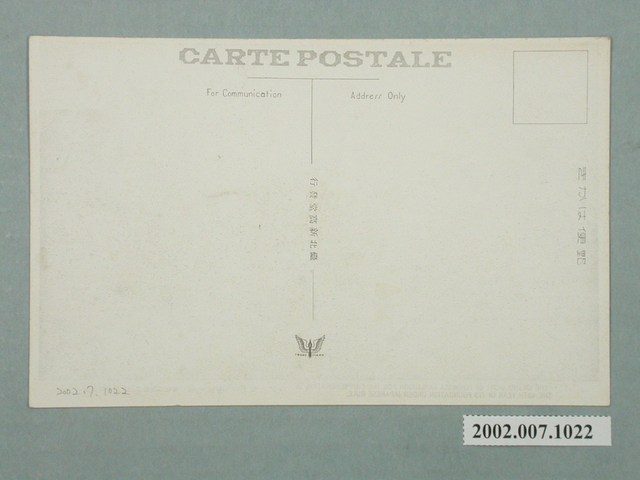 1.本物件為以始政四十周年記念臺灣博覽會,第一會場兒童之國為主題之明信片,正面為兒童之國黑白照片,畫面中可見其建物部份樣貌,主要建物上有「コドモのクニ」字樣,後方有1中國城門式建築,右下有1段文字「始政四十周年紀念臺灣博覽會第一會場コドモノクニ」,左下有1段文字「THE GRAND SIGHT OF FORMOSA EXHIBITION FOR THE CPMMEMORATION OF THE 40TH YEAR OF ITS FOUNDATION UNDER JAPANESE RULE.」;背面為空白明信片橫式書寫面,以黑色單色印刷,右上處為郵票黏貼處,右側有「郵便はかき」字樣,下方有1鳥圖案,上方有「CARTE POSTALE」及2行字樣,由左至右為「For Communication」、「Address Only」,中央有「臺北新高堂發行」字樣。2.始政四十年紀念臺灣博覽會為西元1935年10月至11月以臺北為主舉辦的博覽會,目的為宣傳其統治的政績,及臺灣各項政策的成果,主要分為4個會場,第一會場位於臺北公會堂附近,第二會場於今二二八公園,第三會場於迪化街附近,第四會場於陽明山;此一期間各地政府亦有各自舉辦小規模展覽和活動。兒童之國位於第二會場南邊,其設計者為日本兒童遊樂場創始者長谷公司,內有兒童文化館、鞦韆、木馬等各項設施。