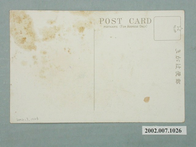1.本物件為以始政四十周年記念臺灣博覽會,第二會場京都館與奈良館為主題之明信片,正面為京都館與奈良館黑白照片,畫面中可見兩館部份樣貌,正前方形式平安神宮之建築即為京都館,右側有1佛像鎮坐者為奈良館,有「奈良館」字樣,後方有1中國城門式建築,照片右側有3位民眾正在牽腳踏車,下方有1段文字「始政四十周年記念臺灣博覽第二會場京都館 奈良館」,右上有1藍色圓形戳印,有飛機、山、椰子樹與建物圖案,有「始政四十周年記念臺灣博覽」字樣;背面為空白明信片直式書寫面,以黑色單色印刷,左上處為郵票黏貼處,有1星形圖案與「NO.128」字樣,上方有「郵便はがき」字樣,左側偏上有「POST CARD」及「POSTKARTE(FOR ADDRESS ONLY)」2行字樣。2.始政四十年紀念臺灣博覽會為西元1935年10月至11月以臺北為主舉辦的博覽會,分為4個會場,第一會場於臺北公會堂附近,第二會場於今二二八公園,第三會場於迪化街附近,第四會場於陽明山,而各地政府也各自舉辦小規模的展覽和活動。京都館位於第二會場,其建築物為以平安神宮作為雛型建造,內為介紹京都之傳統產業,如織物、手工藝等,亦有介紹京都的風景名勝。奈良館為於京都館旁,為占地僅40坪的小型場館。