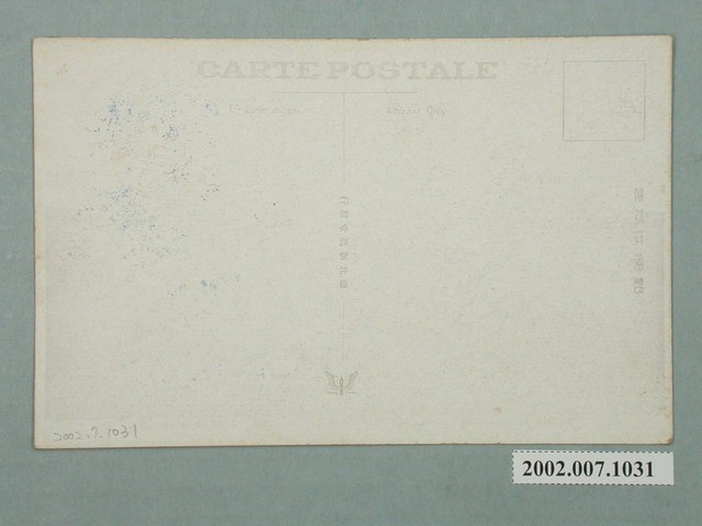 1.本物件為以始政四十周年記念臺灣博覽會,南方館為主題之明信片,正面為臺灣博覽會分場及南方館黑白照片,畫面中可見臺灣博覽會分場入口於正前方,建物上有「始政四十周年記念臺灣博覽會」字樣,有許多民眾正要進入參觀,後方遠處建物則為南方館,下方有2段文字,第1段「(始政四十周年紀念臺灣博覽會)南方館」,第2段「THE GRAND SIGHT OF FORMOSA EXHIBITION, TAIHOKU.」,右上有1藍色圓形戳印,上有建物與山圖案,由上至下有「始政四十周年記念臺灣博覽會」、「昭和十年十月十日至十一月二十八日」2段字樣;背面為空白明信片橫式書寫面,以黑色單色印刷,右上處為郵票黏貼處,右側有「郵便はかき」字樣,下方有1鳥圖案,上方有「CARTE POSTALE」及2行字樣,由左至右為「For Communication」、「Address Only」,中央有「臺北新高堂發行」字樣。2.始政四十年紀念臺灣博覽會為西元1935年10月至11月以臺北為主舉辦的博覽會,分為4個會場,第一會場於臺北公會堂附近,第二會場於今二二八公園,第三會場於迪化街附近,第四會場於陽明山,而各地政府也各自舉辦小規模的展覽和活動。南方館位於大稻埕分館,介紹主題為南洋、南中國、南日本地區的物產特色、開發情形、資源等,有1「南支南洋の地圖模型」,此館之設置與日本南進政策有密切相關。