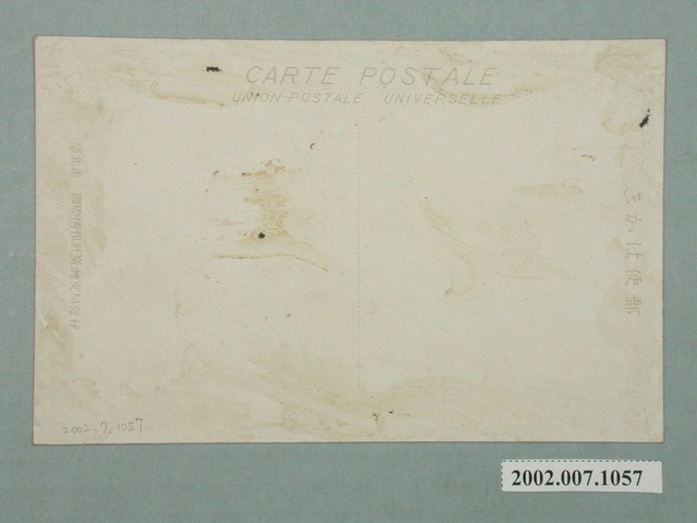 1.本物件以臺灣博覽會為主題,彩色樣式。正面為國防館與第二文化設施館。右側建築物為國防館,外牆以迷彩圖樣裝置,上頭插有兩面紅色旗幟。左側為第二文化設施館,該館正前方上方有一紅色圓點之標記。圖中有三四名人物,皆穿著西式服裝,其中一名男子穿著西裝、兩名女子撐陽傘。明信片下方以漢字與日文書寫「始政四十周年記念臺灣博覽會 國防館と第二文化施設館」。背面右上角為郵票黏貼處,右側有以漢字、平假名書寫之「郵便はがき」,上方以英文字母書寫「CARTE POSTALE」、「UNION POSTALE. UNIVERSELLE」,左側以漢字標示「臺北市國際情報社臺灣支局發行」。2.始政四十年紀念臺灣博覽會為西元1935年10月至11月以臺北為主舉辦的博覽會,目的為宣傳其統治的政績,及臺灣各項政策的成果,主要分為4個會場,第一會場位於臺北公會堂附近,第二會場於今二二八公園,第三會場於迪化街附近,第四會場於陽明山;此一期間各地政府亦有各自舉辦小規模展覽和活動。國防館位於第二會場內,展示主題為日本國內海陸空三軍的軍事設備,並宣傳現代化的軍事國防思想。第二文化設施館位於第二會場東北角,以官廳的展覽品為主,以理番、衛生、警務、司法為主要展示內容,強調日本治理臺灣的文化發展面貌。