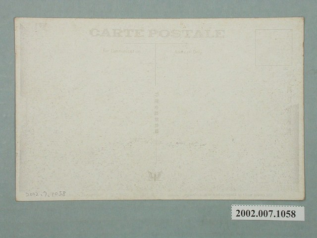 1.本物件以臺灣博覽會為主題,黑白樣式。正面為第二會場之中央廣場的圖像,圖像中間有一噴泉,噴泉下寫有「味の素」之廣告。明信片左側遠景為船舶館,右側為東京館。明信片下方以英文字母書寫「THE GRAND SIGHT OF FORMOSA MEMORIAL EXHIBITIOB, TAIHOKU.」、以漢字書寫「始政四十周年記念臺灣博覽會第二會場 中央廣場」。明信片上方有一藍色戳印「始政四十周年記念臺灣博覽會昭和十年自十月十日至十一月二十八日」,戳章左下角有溫泉圖示。背面右上角為郵票黏貼處,右側有以漢字、平假名書寫之「郵便はがき」,上方以英文字母書寫「CARTE POSTALE」、「For Communication」、「Address Only」,中間以漢字標示「臺北新高堂發行」,下方有一鳥類圖示。2.始政四十年紀念臺灣博覽會為西元1935年10月至11月共50日的博覽會,舉辦地點以臺北為主,為宣傳其統治的政績,及臺灣各項政策的成果,主要分為四個會場,第一會場於臺北公會堂附近,第二會場於今二二八公園,第三會場於迪化街附近,第四會場於陽明山,而各地政府也各自舉辦小規模的展覽和活動。第二會場主要分為兩部分,北邊為展覽館,南邊為娛樂休憩場域,包括迎賓館、子供の國、水族館、海女館、音樂堂、演藝館、映畫館。
