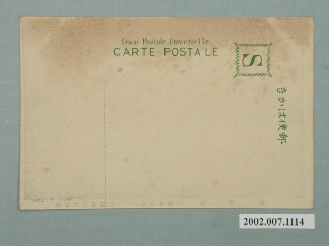 1. 本物件為以東京大正博覽會第二會場臺灣館為主題之明信片,其正面為臺灣館黑白照片,影像中有一座橋搭建於水面上,中央偏左位置有一棟重簷歇山式建築為臺灣館,影像下方標註「東京大正博覽會」、「(第二會場)」、「臺灣舘」。背面為空白明信片直式書寫面,以綠色單色印刷,左上方框邊線以鋸齒造型,中間寫有英文「S」,上方標註「郵便はがき」,左方標註「Union Postale Universelle.」、「CARTE POSTALE」,中間偏下位置有一虛線分隔線。2. 西元1914年3月20日至7月31日期間,為了慶祝日本嘉仁天皇登基,於東京上野公園舉行「東京大正博覽會」,臺灣館位於不忍池上的觀月橋旁。日治時期臺灣館於島外的展出,通常以閩南式臺灣家屋或中國式宮殿建築為展覽館造型,展出物品包含臺灣物產展示、風土民情的人偶塑像,對於日本的展出主要為提升國民對新領土臺灣的認識。