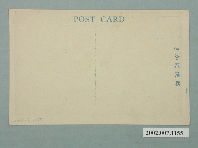 1. 本物件為以平和紀念東京博覽會臺灣館為主題之明信片,其正面為臺灣館黑白照片,影像為一棟廟宇式建築物側面,其前方道路有數名行人三五成群走動,影像下方標註「平和紀念東京博覽會」、「臺灣館」、「(第二會場)」。背面為空白明信片橫式書寫面,以藍色單色印刷,右上角方框為郵票黏貼處,右側標有「郵便はがき」,明信片上方偏右位置標有「Post Card」,中間有一分隔線。2. 西元1922年3月10日至7月31日為第一次世界大戰後的和平祝福,東京府於上野公園舉辦「平和紀念東京博覽會」。臺灣館由臺灣總督府直營,位於第二會場不忍池畔,外觀為臺灣廟宇建築風格,由1棟平房及2層樓建築構成,並分為展覽品陳列空間、喫茶店及貴賓招待所。