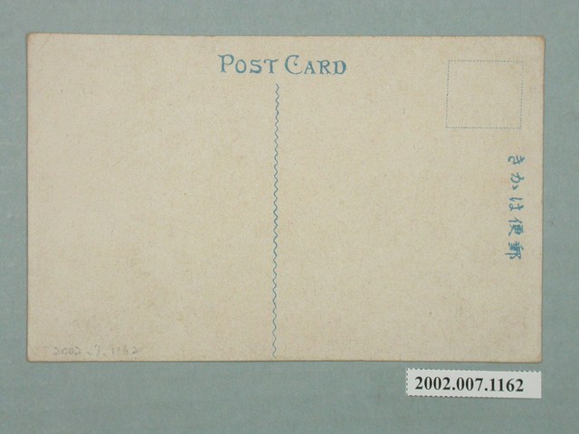 1. 本物件為以平和紀念東京博覽會臺灣館第二會場為主題之明信片,其正面為臺灣館彩色繪圖,影像呈現粉紅色之色調,圖中有一中式建築物側面,以朱紅色為屋頂,綠色作為屋頂上的燕尾,影像下方標註「(平和記念東京博覽會)」、「臺灣館」、「第二會場」。背面為空白明信片橫式書寫面,以藍色單色印刷,右上角方框為郵票黏貼處,右側標有「郵便はがき」,明信片上方偏右位置標有「POST CARD」,中間有一分隔線。2. 西元1922年3月10日至7月31日為第一次世界大戰後的和平祝福,東京府於上野公園舉辦「平和紀念東京博覽會」。臺灣館由臺灣總督府直營,位於第二會場不忍池畔,外觀為臺灣廟宇建築風格,由1棟平房及2層樓建築構成,並分為展覽品陳列空間、喫茶店及貴賓招待所。