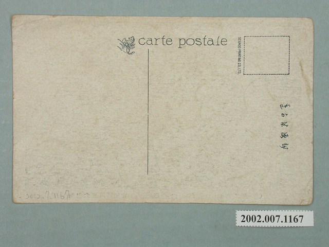 1. 本物件為以平和紀念東京博覽會臺灣館為主題之明信片,其正面為臺灣館黑白照片,影像中央偏左有一兩層樓式的中式建築物,其上方屋頂有燕尾結構,其下方偏左位置之竹製籬笆內種有數棵植物,影像下方標註「平和記念東京博覽會」、「臺灣舘」、「(第二會塲)」。背面為空白明信片橫式書寫面,以藍黑色單色印刷,右上方框為郵票黏貼處,其左側有「SEIUNDO PRONTING CO., LTO.0」,明信片右側有「郵便はがき」,上方有一飛馬圖樣,其右側寫有「carte postale」,中央有1分隔線。2. 西元1922年3月10日至7月31日為第一次世界大戰後的和平祝福,東京府於上野公園舉辦「平和紀念東京博覽會」。臺灣館由臺灣總督府直營,位於第二會場不忍池畔,外觀為臺灣廟宇建築風格,由1棟平房及2層樓建築構成,並分為展覽品陳列空間、喫茶店及貴賓招待所。