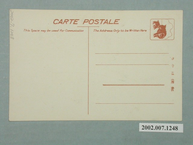 1. 本物件為以第九回臺灣美術展覽展出品手風琴為主題之明信片,其正面為一名女士手拿手風琴黑白繪圖,圖畫中有一名穿著旗袍的女性,坐在花布的椅子上,將手風琴置於大腿處,以雙手演奏,圖畫上方標示「第九回臺灣美術展覽會出品」,下方標示「アコーデオン」,「陳氏進筆」。背面為空白明信片直式書寫面,以橘紅色單色印刷,左上角方框中印有一隻大熊與一隻小熊的圖樣,圖樣右側位置標註「郵便はがき」,明信片左方以英文印有「CARTE POSTALE」,及左下「This Space may be used for Communication」,左上「The Address Only to be Written Here」,中間有一條分隔線。2. 臺灣美術展覽會為日治時期臺灣總督府開辦的年度藝術展覽活動,簡稱「臺展」,在西元1927年至1936年期間共舉行10回。第九回臺灣美術展覽於昭和10年(1935)舉辦。陳氏進(陳進),為臺灣人東洋畫家,1929年畢業於東京女子美術學校,本籍為新竹,在1934至1938年期間曾任教於屏東高等女學校。