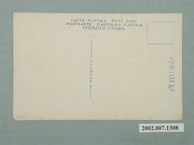 2.正面影像滿版印刷,右上方印有紅色文字「官幣大社台灣神社、Taiwan Shrine.」等字。背面印刷有「郵便ハガキ、CAPTE POSTALE POST CARD、POSTKARTE CARTOLINA POSTALE、OTEPbITOE IINCbMO、生蕃屋商店發行」等字。