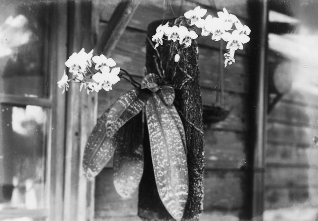 1.本物件為以蝴蝶蘭為主題之照片,為黑白照片,畫面中可見其培育方式並非於樹上或盆栽中,為懸掛式,以水苔方式種植,開出朵朵純白淨潔的花朵;背面左上角有1紅色橢圓戳印,有「增村」字樣,中央有1標籤,有「225 蝴蝶蘭」字樣。2.蝴蝶蘭於西元1896年被發現於蘭嶼,其分布南至澳洲,北至臺灣,喜好高溫潮濕環境,於1910年代臺灣各地開始栽種蝴蝶蘭,舉辦大型品評會、競賽等,也明禁採取野生蝴蝶蘭,至1930年代,屏東逐漸成為蝴蝶蘭的重要培植地1935年更成立「全臺灣蘭蕙會」,提供愛蘭人士相互交流、推廣蘭藝的平臺。