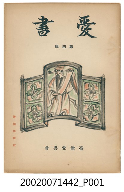 1.本件《愛書》第四輯的封面為米黃色,封面中間花窗中有天官圖案,上方橫書「愛書」、「第四輯」,下方橫書「臺灣愛書會」,左下角有直書「裝幀特輯號」等字,外觀泛黃,保存完整。