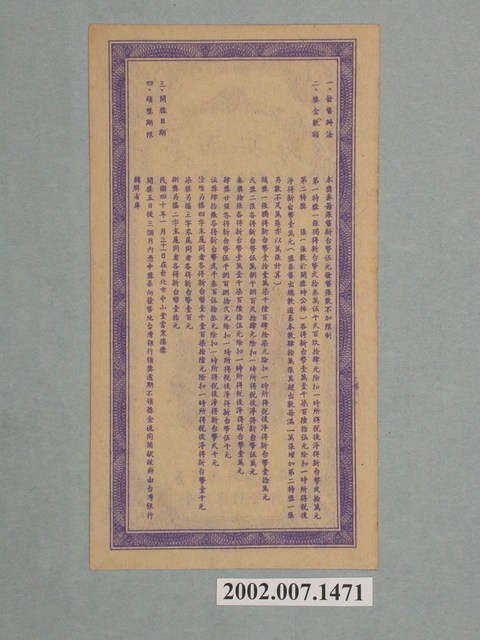 基本發行張數為四十萬張,直式鈔券式設計,藍紫色網底紋幾何花形邊框,由上而下分別為,刊頭「愛國獎券」,(第十八期),飾莨苕葉橢圓框,編號T003695,面額新台幣伍圓以花形框飾網底紋樣,5和伍字樣飾花形框置於四角落,臺灣省政府委託臺灣銀行發行,中央印製廠台北廠。