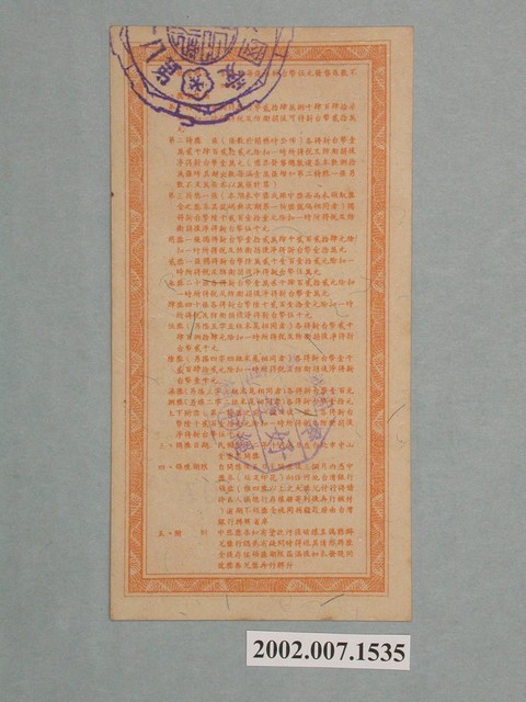 基本發行張數為八十萬張,直式鈔券式設計,橘色網底框,框內上下裝飾連珠紋,刊頭(第八十二期),「愛國獎券」四字白文置於飾勳章及渦卷式莨苕葉紋框中,以臺大醫院的圖案為軸心,面額新台幣伍圓,白文置於框內,框上下飾連珠紋,左右飾卷葉,編號CK354907,編號下飾雙梅花及愛國致富浮水印,「節約增產」四個字置於四角,臺灣省政府委託臺灣銀行發行,中央印製廠台北廠。