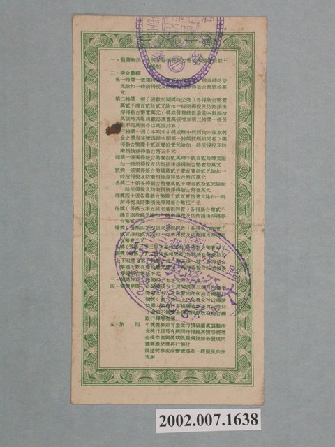 基本發行張數為八十萬張,直式鈔券式設計,中央印製廠,綠色網底框,刊頭「第壹佰捌拾伍期」,「愛國獎券」四字白文置於框內,框飾莨苕葉,以台南開元寺塔圖為軸心,「台南開元寺塔」六字直式置於圖案左上方,面額新台幣伍圓,白紋置於框內,框左右飾卷葉紋,編號GS695832,編號下飾雙梅花及愛國獎券浮水印,「恭賀新禧」四個字,飾花框置於四角,臺灣省政府委託臺灣銀行發行,期數「185」以阿拉伯數字白文置於框下並置中,左右飾西洋紋飾。