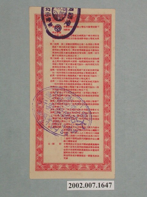 基本發行張數為八十萬張,直式鈔券式設計,中央印製廠,紅色網底框,刊頭「第壹佰玖拾肆期」,「愛國獎券」四字白文置於卷頁框內,以台北東門圖為軸心,「台北東門」四字橫式置於圖右上方,面額新台幣伍圓,白紋置於框內,編號000797,編號下飾愛國獎券浮水印,「驅逐俄寇」四個字,飾花框置於四角,臺灣省政府委託臺灣銀行發行,期數「194」以阿拉伯數字白文置於框下並置中,左右飾西洋紋飾。