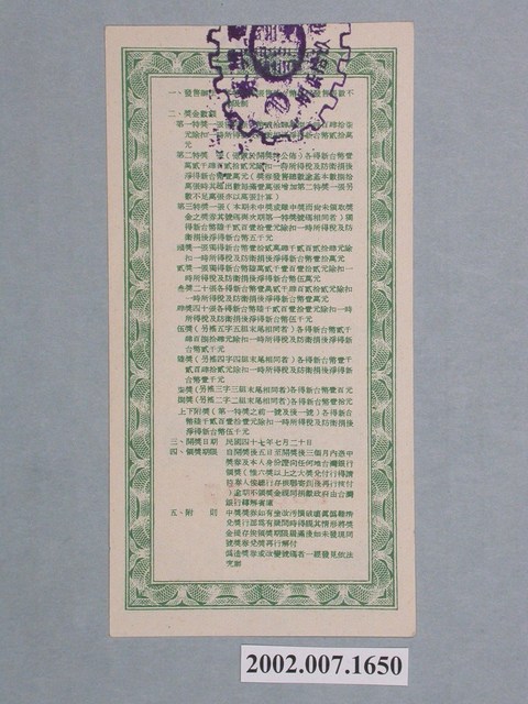 基本發行張數為八十萬張,直式鈔券式設計,中央印製廠,綠色網底框,刊頭「第壹佰玖拾柒期」,「愛國獎券」四字白文置於框內,框上飾網底紋,下莨苕葉等西洋紋飾,以蘆溝橋的圖案為軸心,「蘆溝橋」三字橫式置於圖右上方,面額新台幣伍圓,白紋置於框內,框飾葉紋,編號733977,編號下飾愛國獎券浮水印,「還我河山」四個字,飾花框置於四角,臺灣省政府委託臺灣銀行發行,期數「197」以阿拉伯數字白文置於框下並置中,左右飾西洋紋飾。