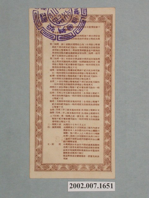 基本發行張數為八十萬張,直式鈔券式設計,中央印製廠,褐色網底框,刊頭「第壹佰玖拾捌期」,「愛國獎券」四字白文置於框內,框上飾幾何形網底紋,下飾莨苕葉,以台南法華寺塔的圖案為軸心,「台南法華寺塔」六字橫式置於圖右上方,面額新台幣伍圓,白紋置於框內,框飾卷葉紋等西洋紋飾,編號501163,編號下飾愛國獎券浮水印,「平均地權」四個字,置於四角,臺灣省政府委託臺灣銀行發行,期數「198」以阿拉伯數字白文置於框下並置中,左右飾西洋紋飾。