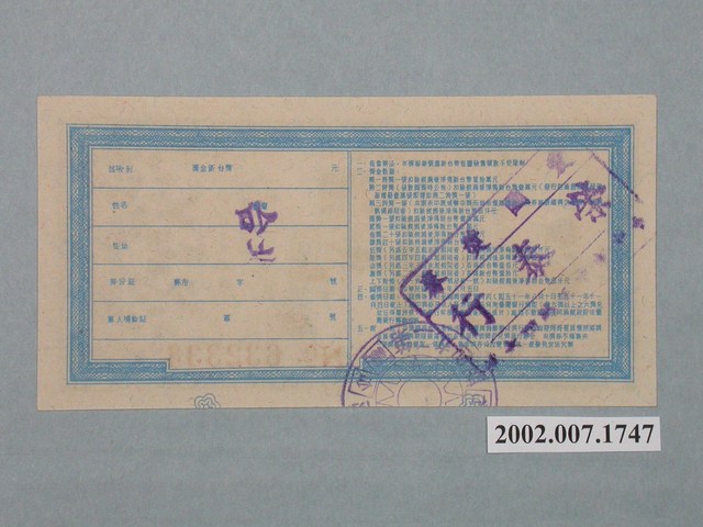 基本發行張數為八十萬張,橫式設計,梁又銘繪製,中央印製廠,水藍色文底回紋框,刊頭「生產建國」四字直式置於框右,底飾網紋,旁以梅花為中心飾券葉紋,「第294期」橫列,「51‧8‧5開獎」直式置於下,扇枕溫衾圖,題跋及題詩「黃香扇枕溫衾(二十四孝之一)」,「冬月温衾暖,炎天扇枕凉;兒童知人職,千古一黄香。」置於圖右,「新台幣伍圓」直式置於框左方,上下飾一朵梅花,「愛國獎券」四字,底飾花紋編號「No632333」橫式列於圖下,框下小字「臺灣銀行印刷所」。