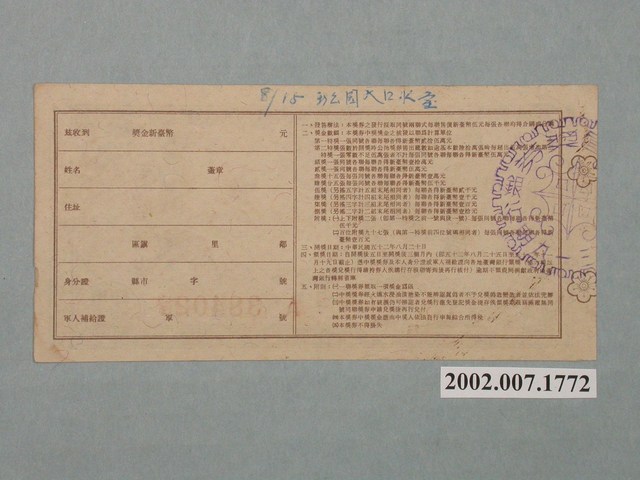 基本發行張數為六十萬張,橫式設計,深褐、紫色紋框,由右至左,刊頭葉紋下圓框內「2甲‧聯」,「愛國獎券」,「公正廉潔 謹慎勤勉」,下列編號「A 384027」底飾愛國致富浮水印,往左為「蘇武 持節牧羊」圖,圖下「第319期」,左上列「中華民國五十二年八月二十日開獎」,圖左「新臺幣伍圓」,飾紫色芙蓉花叢,框上飾連續心紋,左右飾卷回紋。