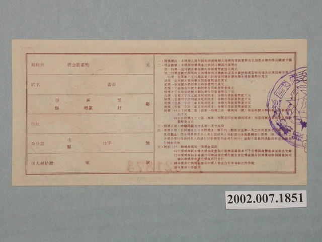 基本發行張數為六十萬張,橫式設計,淡黃色紋底,連珠框,左右飾渦卷葉開光內圓形「莒光樓」圖,圖上列「愛國獎券」,圖右「莒光樓」,「臺灣省政府委託臺灣銀行發行」,下列編號「A321873」底飾愛國獎券浮水印,圖左「中華民國五十五年元月十五日開獎」,右下「第398期」,「甲聯」,左下「新臺幣伍圓」。