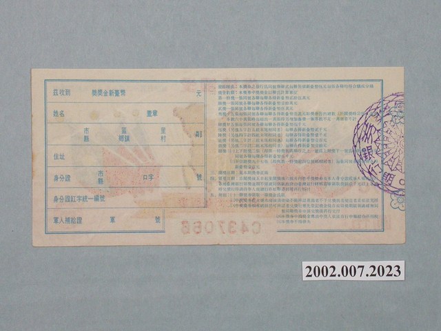 基本發行張數為六十萬張,橫式設計,中心「慶祝臺灣光復節」,大陸臺灣版圖、國旗圖,右下「丙聯」圓框,由右至左,上列「中華民國五十九年十月二十五日開獎」,「愛國獎券」,「臺灣省政府委託臺灣銀行發行」,左下「第570期」,「新臺幣伍圓」,下列編號「C437066」,底飾愛國致富浮水印。