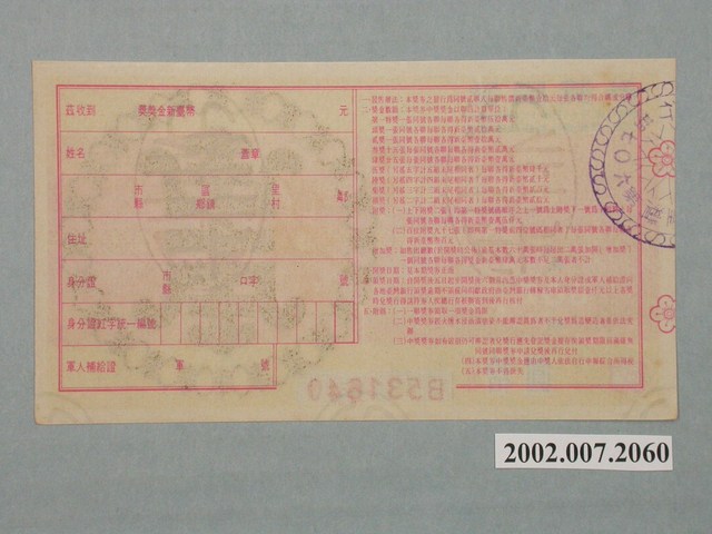 基本發行張數為六十萬張,橫式設計,壽字圖,「恭祝總統華誕」,底列編號「B531640」新速實簡浮水印,「愛國獎券」,「中華民國六十年十一月五日開獎」,「臺灣省政府委託臺灣銀行發行」,「第607期」,「新臺幣拾圓」,「乙聯」。