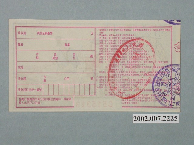 基本發行張數為六十萬張,橫式設計,「(漢) 陳平 分肉公平」圖,題跋:「平為里中社分肉,甚均,父老曰:『善哉陳孺子分肉』,平曰:『使吾得宰天下,亦如此肉矣』,後平為漢相,佐高祖定天下」。底列編號「C515313」勤勞儉樸浮水印,「愛國獎券」,「中華民國六十五年六月五日開獎」,「臺灣省政府委託臺灣銀行發行」,「第772期」,「新臺幣拾圓」,「丙聯」。根據參考資料及梁又銘家屬提供的資料佐證,梁又銘先生自1962年起參與愛國獎券故事圖案繪製,於1971年介紹學生林幸雄參與愛國獎券製作(599期起),主要負責設計周邊圖案,以及特殊慶典、故宮文物、風景等圖案繪製。歷史故事畫稿仍由梁又銘先生提供,並多數有梁之鈐印,直到梁於1984年9月26日逝世後,愛國獎券仍持續發行其遺稿直到第1107期。而林幸雄先生則參與愛國獎券製作直到最後一期1171期。