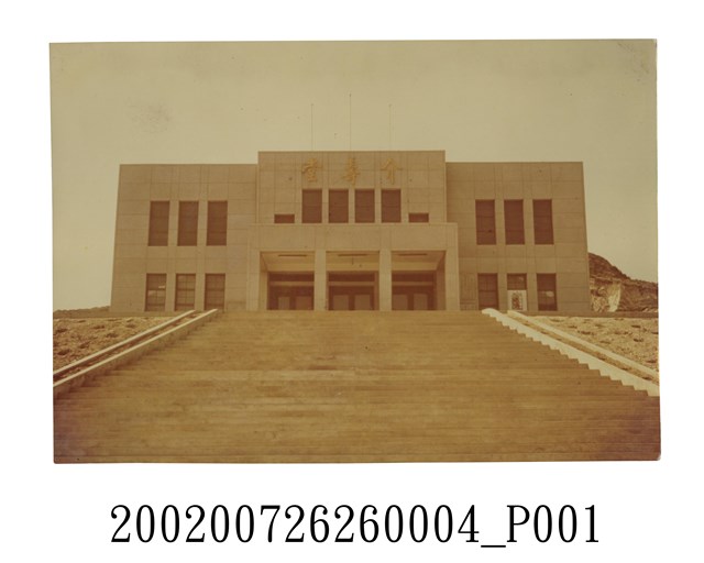 1.本物件為馬祖戰地為主題的照片,彩色樣式。照片正中央是通往一棟兩層樓建築物的階梯正拍圖,該建築物上以漢字刻有「介壽堂」的黃色字樣。該建築物為左右對稱的建築形式,一樓與二樓,左右各有三扇窗戶。