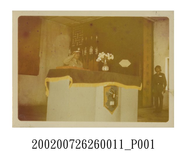 1.本物件以馬祖戰地為主題的照片,彩色樣式。照片為一男子站在講臺後敬禮的情景。由講臺右前方所攝之照片可見拍攝場景為室內,該名發言的男子身著淺色軍服,頭戴軍帽。講臺舖有深色桌巾,臺上放有一壺白色花飾,講桌前有一戰士騎馬的圖示。講桌附近立有四面國旗,旁有一軍人身著深色軍服、頭戴鋼盔呈立正姿勢。