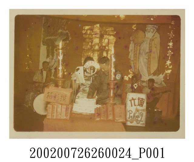 1.本物件以馬祖戰地為主題的照片,彩色樣式。照片為馬祖守備區彭啟超指揮官正在摸彩的情景。由照片可見該摸彩場地布置非常喜氣,背景為紅色,以金色寫有一大字「壽」,背景右方有一土地公。馬祖守備區彭啟超指揮官將手伸進箱子,正在摸彩。摸彩箱放置於一紅桌上,桌上放有其他紅紙包裝的禮品,且桌子兩旁放置一對紅色蠟燭,桌子旁則有一白色包裝,上頭有「大埔」兩字。