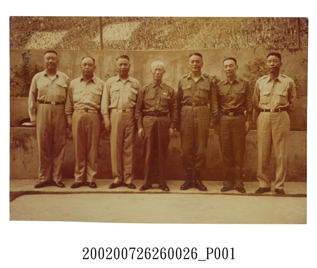1.本物件以馬祖戰地為主題的照片,彩色樣式。照片為馬祖守備區彭啟超指揮官與副總統行前合影的情景。由照片可見七位人士皆身著軍服,右一、右五、右六、右七者身著淺色軍服,右二、右三、右四者身著深色軍服。右三者為馬祖守備區彭啟超指揮官。