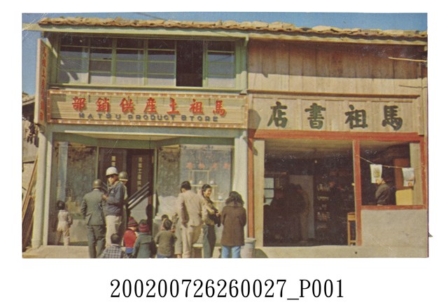 1.本物件以馬祖戰地為主題的照片,彩色樣式。照片為馬祖街景一隅的情景。由照片可見兩間商店,照片右側為馬祖書店,照片左側為馬祖土產供銷部。兩間商店街為兩樓式建築,二樓為矮閣樓形式,皆為木造。馬祖書店外觀為褐色,書店招牌為黑色設計。馬祖土產供銷部外觀為綠色,供銷部招牌為紅色設計,下方以英文字母書寫「MATSU PRODUCT STORE」,且該店門外門庭若市,有數位大人帶著小孩前去光顧。
