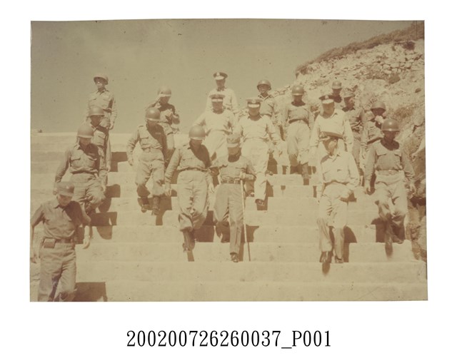 1.本物件以馬祖戰地為主題的照片,彩色樣式。照片為陳誠副總統蒞馬視察的情景。由照片可見十九位軍人身著淺色、深色軍服,頭戴鋼盔、軍帽,正在由階梯走向大維港。