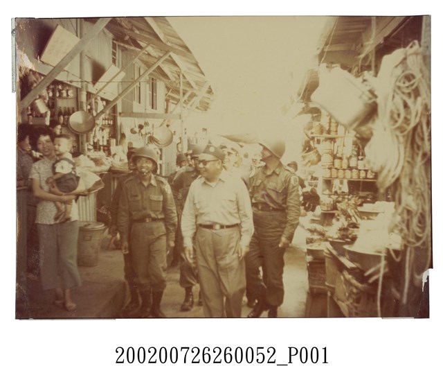 1.本物件以馬祖戰地為主題的照片,彩色樣式。照片為國防會議副秘書長蔣上將蒞馬視察的情景。由照片可見拍攝地點為戶外,應為市集,照片左右有雜貨店,擺放罐裝物品。照片左方有一婦女手上抱著一名孩童。由頭戴軍帽、佩戴墨鏡的蔣經國走在青蕃村街道,位於隊伍前頭,左右皆有身著長袖軍服、頭戴鋼盔的士兵一同行走。