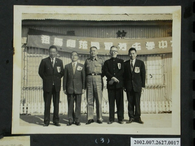 2002.007.2627.0017 彭指揮官與華僑中學黃君述總幹事及大專學生春節勞軍團領隊張建邦合影