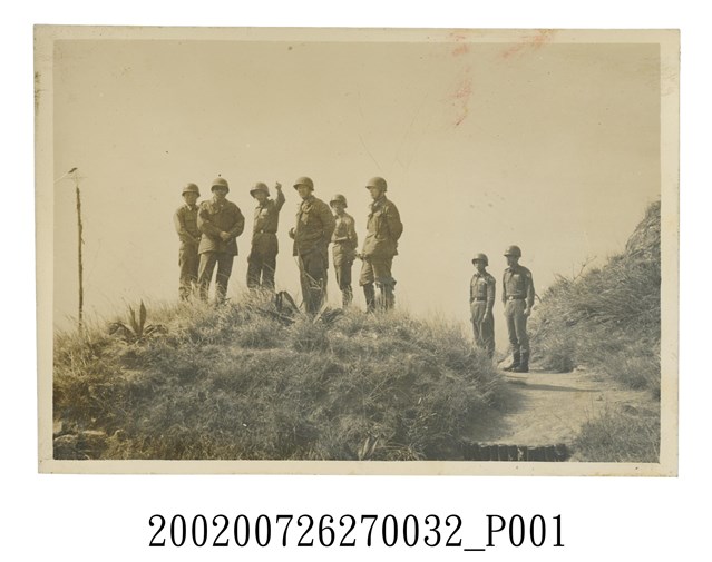 1.本文物為彭啟超指揮官視察南竿守備隊照片,黑白樣式,照片中可見8名官兵,皆身穿軍服,頭戴鋼盔,其中左2應為彭啟超,雙手交握於身前,聆聽其左手邊之官兵報告,右1與右2應為警衛兵,場所位於戶外。
