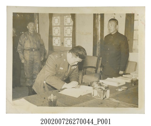 1.本文物為江海東少將蓋印照片,黑白樣式,照片中可見3名男子,右1身穿黑色中山裝,畫面中央者與左1皆身穿軍服,惟樣式略有不同,畫面中央者為江海東,正在彎腰於一書上蓋印,左1為彭啟超指揮官,呈立正姿勢站於畫面左側,畫面右下方為1桌子,擺放書籍,並供江海東蓋印的空間,場所位於室內。
