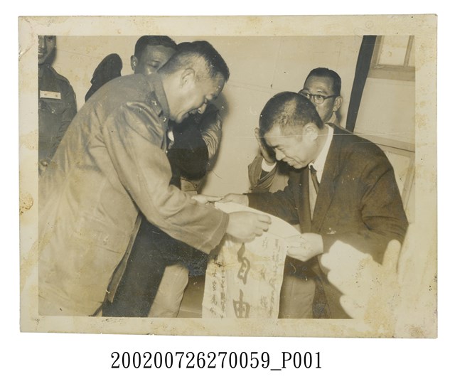 1.本文物為臺灣進出口商馬祖前線勞軍團陳茂榜團長獻旗照片,黑白樣式,照片中可見4名男子,其中畫面前方2位右者為陳茂榜,身穿黑色西裝套裝,雙手遞出寫有「自由」字樣之錦旗,左者為彭啟超,身穿軍服,正伸出雙手接過陳茂榜贈予之錦旗,場所位於室內。