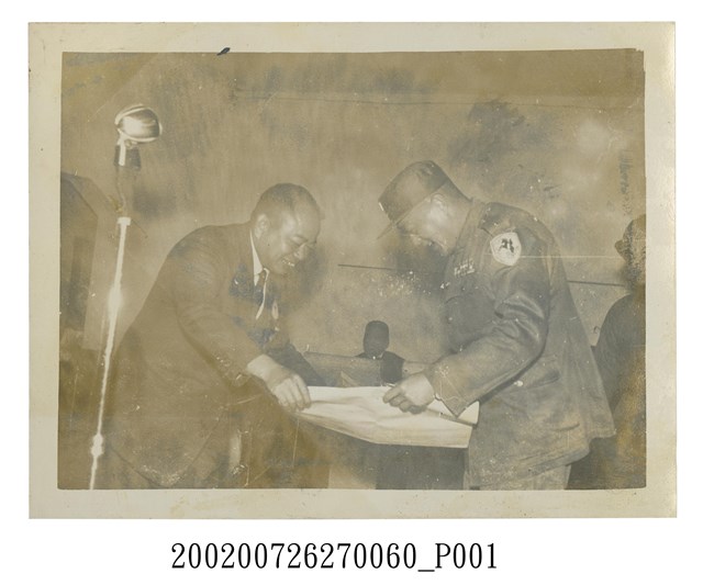 1.本文物為臺灣進出口商馬祖前線勞軍團陳茂榜團長獻禮品照片,黑白樣式,照片中可見2名男子,右者為彭啟超指揮官,身穿軍服,頭戴軍帽,身子微微向前彎,欣賞陳茂榜獻予的禮品,左者為陳茂榜,身穿黑西裝套裝,一同欣賞禮品,畫面左側有1直立式麥克風,場所位於室內。