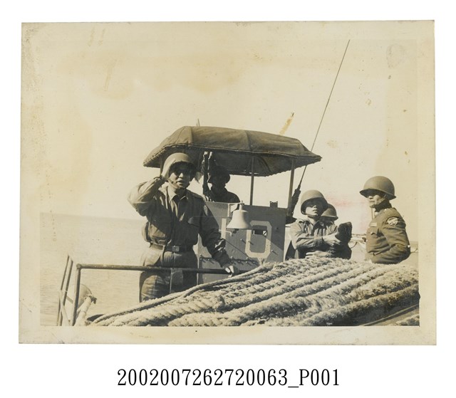 1.本文物為彭啟超指揮官前往視察白犬守備隊於船艇上照片,黑白樣式,照片中可見4名官兵,皆身穿軍服,頭戴鋼盔,左1為彭啟超,佩戴墨鏡,正在伸手比劃,畫面下方有繩索,畫面後方為船隻駕駛室,駕駛室前方有「10」字樣,船隻在前往莒光鄉的海上。
