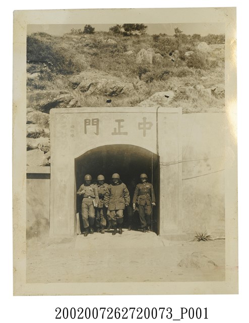 1.本文物為西犬指揮所照片,黑白樣式,照片中可見4名官兵,皆頭戴鋼盔,除右2身穿軍外套外,其餘皆身穿軍服,4人皆正要步出1水泥搭建關口,上有「中正門」字樣,左邊落款人是田樹樟,應是他擔任指揮官時所建的坑道。