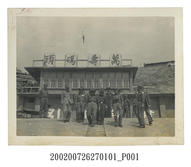 1.本文物為萬壽碼頭照片,黑白樣式,照片中可見多名官兵,皆身穿軍服,頭戴軍帽,畫面中央者為彭啟超指揮官,佩戴墨鏡,正在步下階梯,畫面後方可見1建築物,上有「萬壽碼頭」字樣,場所位於萬壽碼頭。