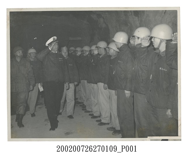1.本文物為海軍總司令黎玉璽上將於中興戰道內之黑白照片,照片中可見數名官兵,畫面右側至中央有1排官兵列於此,皆身穿海軍外套,頭戴鋼盔,向左3行舉手禮,左1為彭啟超指揮官,身穿軍外套,頭戴鋼盔,左3為黎玉璽,身穿海軍外套,頭戴軍帽,亦向列對官兵們行舉手禮,場所位於中興戰道內。